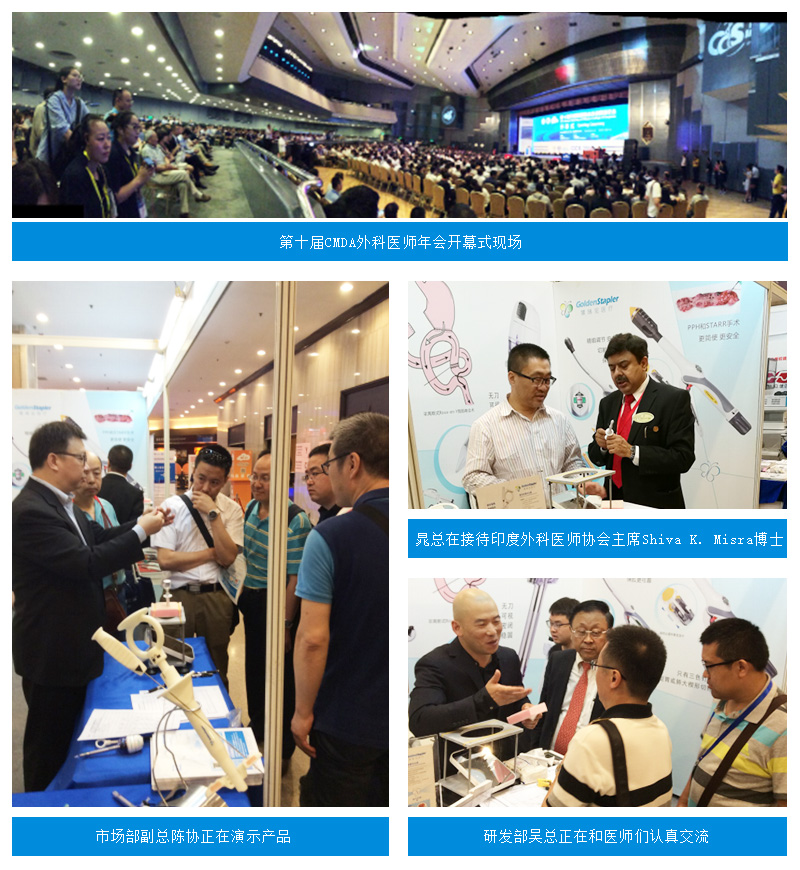 有很多医师对健瑞宝腔镜切割吻合器,表现出浓厚的兴趣,公司研发部副总吴惟民,向来访医师回答了有关”不等高缝钉成型高度排列”的原理和临床好处。健瑞宝腔镜切割吻合器分三种长度,适合开放手术,普通病人腹腔镜手术和肥胖病人腔镜手术。一个器身可以通配所有钉仓,给临床手术带来很大的便利性,医师可以根据切割位置选择关节头或直头钉仓,根据组织长度选择45mm或60mm钉仓,根据组织厚度选择白色、蓝色、金色和绿色钉仓。对于胃肠道肿瘤病人手术,江苏泰兴医院蒋主任认为,“每次使用全新的钉仓,包括抵钉板、钉仓夹、切割刀等,可以预防肿瘤种植转移,对无瘤手术有很高的经济价值。