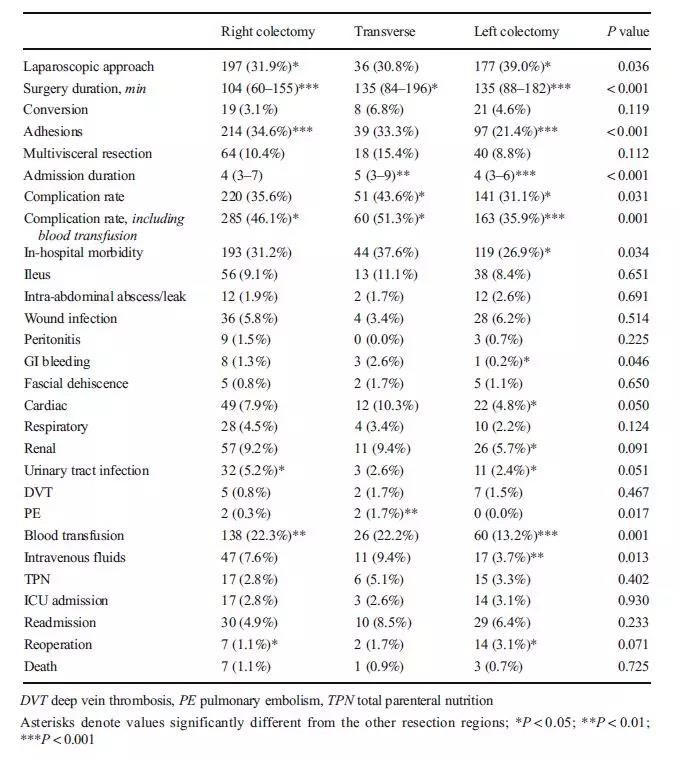横结肠(TC)病人共117例,主要特点为:常常需要做多脏器切除,而且需要增加一天住院,并发症比率更高 (RC 35.6% vs. 43.6% vs. LC 31.1%, P=0.032)。