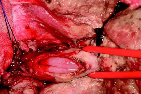 开胸检查,发现在食管和胃连接处,食管纵行裂开,大家可以看图,红带子牵拉的是食管,左方就是食管的裂口,粉红色的是食道黏膜。