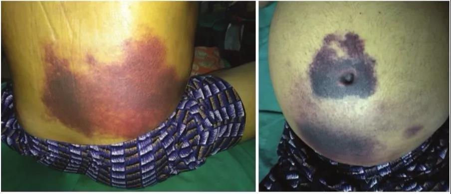 不久,两侧腰部可以看到斑片状淤血,肚脐眼那里可以看到像澳大利亚地图形状的淤血斑块,整个腹部瘀斑和正常皮肤颜色交织在一起,形成一个世界地图,请参见附图。
